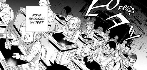 C’est un univers assez simple qui s’ouvre devant nous, en tout cas, c’est ce que nous laissent penser les apparences, mais très rapidement, ça va se gâter, pour devenir quelque chose d’unique et d’incroyablement passionnant. Effectivement, de prime abord, on plonge dans un orphelinat plutôt tranquille, mais qui paraît tout de même assez isolé, coupé du monde même, qui existe presque en vase clos, sans aucune technologie, ou indice de modernité. Mais il y fait bon vivre, les enfants sont heureux, ils forment une vraie fratrie, les plus grands s’occupent des plus jeunes, le tout dans une parfaite harmonie. C’est un joli petit rêve, même pour nous lecteurs, c’est mignon, ça donne le sourire, jusqu’à ce que le cauchemar commence et que nous tombions dans une spirale infernale radicale, autant pour nous, que pour nos petits héros. A partir de ce moment, c’est un monde bien différent que nous découvrons, qui nous fera littéralement froid dans le dos, presque horrifique même, c’est très sombre, glauque et carrément effrayant même. C’est dans ce cadre que nous suivons Emma, Norman et Ray, les trois aînés, qui vont malheureusement comprendre le pot aux roses, qui vont ainsi tout entreprendre pour sauver les leurs. Kaiu Shirai nous a concocté un scénario assez bluffant, je ne m’attendais pas du tout à ça, il m’a tenu en haleine du début à la fin, pour nous offrir une aventure extraordinaire, qui ne nous laissera pas une seconde de répit. C’est une intrigue spectaculaire, extrêmement bien ficelée, terriblement riche en rebondissements, personne ne pourra en sortir indemne, tant ce qu’il va se dérouler ici est éprouvant pour nos nerfs et nos sentiments. Le tout est admirablement illustré par Posuka Demizu, j’ai adoré son style, il parvient parfaitement à retranscrire les émotions des personnages, autant qu’à mettre en scène les éléments les plus violents, c’est saisissant d’intensité.